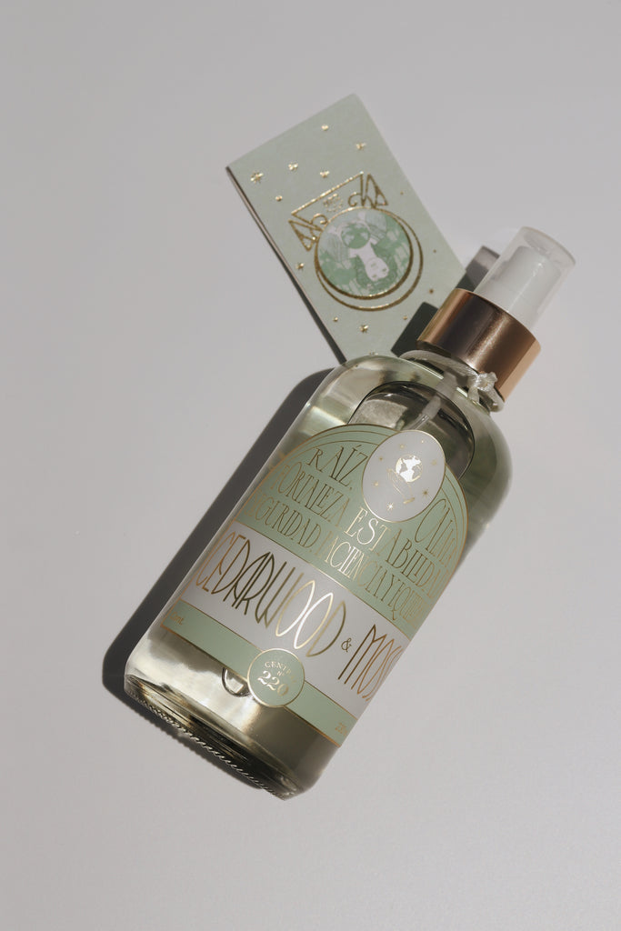 Cada rociada despliega el frescor verde de agujas de cedro, ciprés y coníferas, que se mezclan con la profundidad de la tierra negra. El cedro atlas y texas refuerzan la sensación de solidez, mientras que la vainilla, el pachuli, el almizcle blanco y el musgo de roble envuelven el espacio con serenidad y calidez.